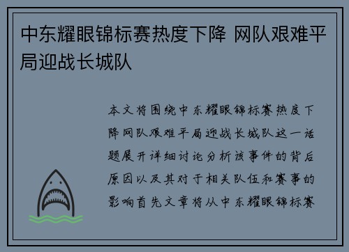 本文将围绕“中东耀眼锦标赛热度下降 网队艰难平局迎战长城队”这一话题展开详细讨论,分析该事件的背后原因以及其对于相关队伍和赛事的影响。首先,文章将从中东耀眼锦标赛的热度下降这一背景入手,探讨其可能的原因。接着,分析网队在比赛中面临的困境及其...